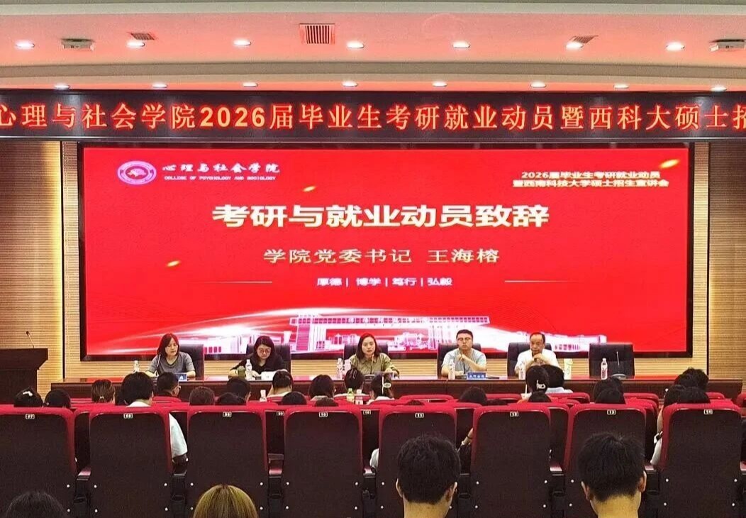 为助力学生明晰考研方向、规划备考之路,精准把握备考节奏。心理与社会学院于10月9日下午在厚德楼247教室召开2026届毕业生考研就业动员暨西南科技大学硕士招生宣讲会。学院党委书记王海榕,院长助理木呷古布,教师代表王洲淋、赖渝,西南科技大学王斌教授一行出席会议,毕业班辅导员、2026届和2027届全体在校学生参会。会议由学院党委副书记陈奕主持。