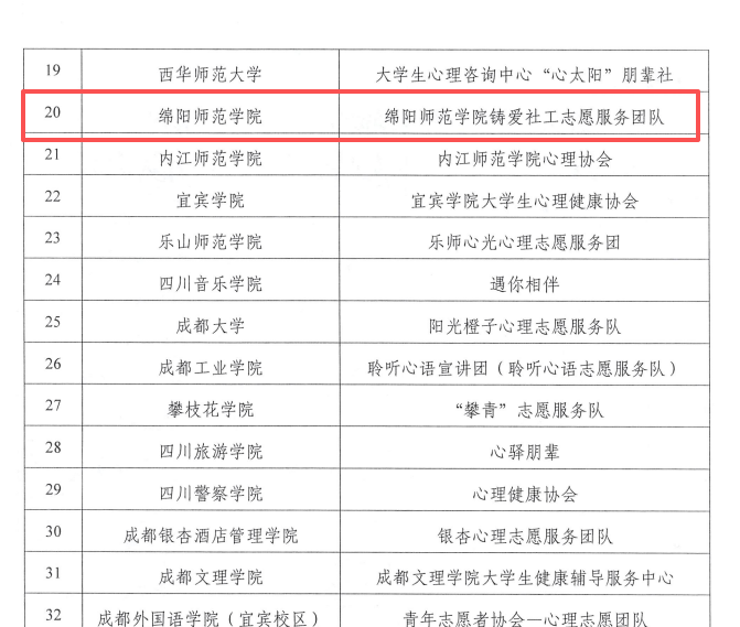 此次入选不仅是对我校心理健康服务工作的肯定,更是对团队成员专业能力与社会担当的认可。未来,心理健康教育中心将继续发挥学科优势与组织优势,深耕青少年心理健康领域,为推动全省高校心理志愿服务高质量发展贡献更多绵师力量。