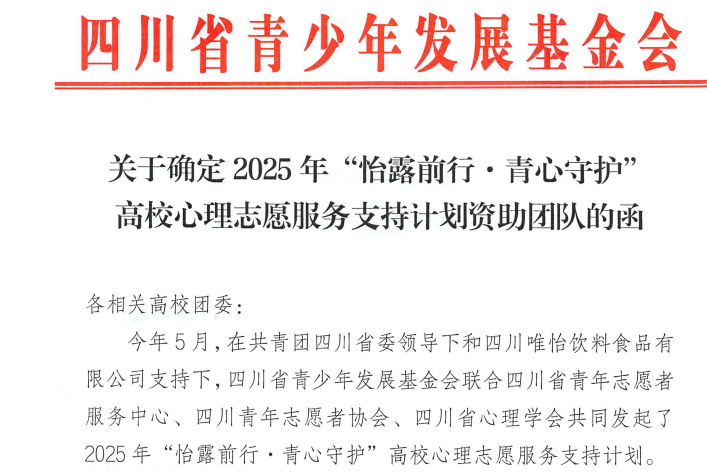 此次“怡露前行?青心守护”计划由共青团四川省委指导,四川省青少年发展基金会联合四川省青年志愿者服务中心、四川青年志愿者协会、四川省心理学会共同发起,四川唯恰饮料食品有限公司提供支持,旨在汇聚高校力量,推动青少年心理健康志愿服务专业化、常态化开展。自项目启动以来,我校高度重视,迅速整合心理健康教育中心专业资源与校团委志愿组织优势,由心理与社会学院赖渝教授全程指导,组建起一支兼具专业素养与服务热情的志愿团队,围绕“青少年心理支持”核心需求,精心设计服务方案,最终凭借扎实的专业基础、创新的服务模式和清晰的实施计划,赢得评审专家一致认可。