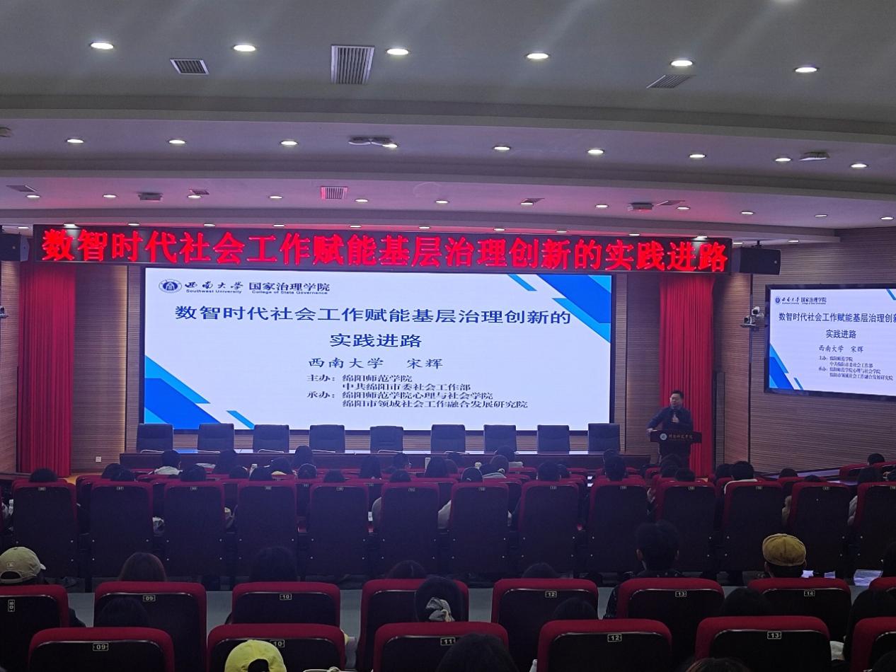 11月3日下午14:00,由中共绵阳市委社工部和绵阳师范学院主办,绵师心理与社会学院、绵阳市领域社会工作融合发展研究院联合承办的“数智时代社会工作赋能基层治理创新的实践进路”专题报告会在绵阳师范学院高新校区厚德楼247学术报告厅举办。西南大学国家治理学院宋辉教授、博士生导师应邀作主旨报告,全市社会组织代表、基层社区代表和心社学院师生代表参加本次报告会。