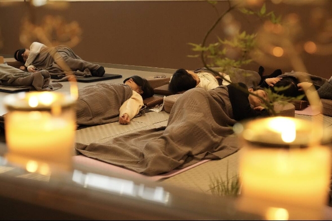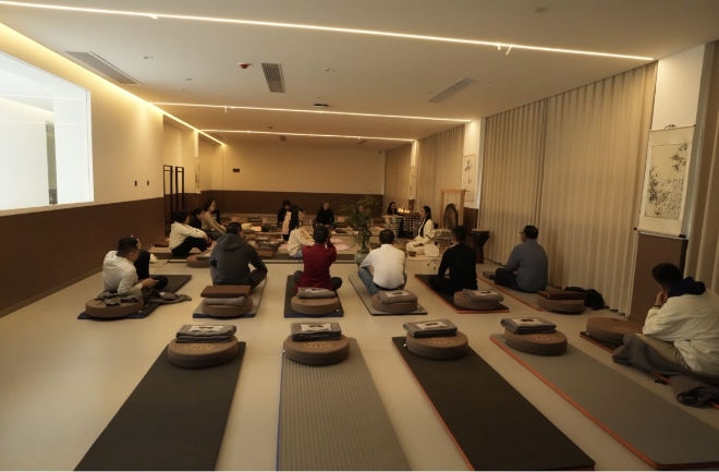 活动现场,专业疗愈师先向教职工讲解颂钵音声疗愈的原理与功效,随后引导大家在静谧的疗愈室内静坐放松。随着颂钵、水晶钵等乐器被轻轻敲击,低沉悠远的音波缓缓扩散,老师们跟随指导调整呼吸,让身心随音律起伏逐渐舒展,原本紧绷的状态在自然音声中慢慢松弛,现场氛围宁静而治愈。
