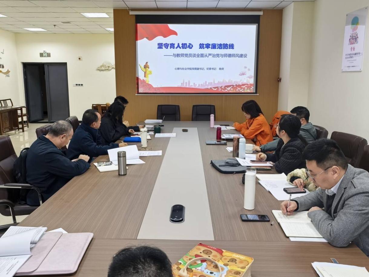 为进一步夯实深入贯彻中央八项规定精神学习教育工作成效,强化党员教师思想政治建设,推进作风建设常态化长效化,11月6日,心理与社会学院党委副书记、纪委书记陈奕以“坚守育人初心、筑牢廉洁防线,与党员教师谈全面从严治党与师德师风建设”为题,为班子成员和党员教师讲授党风廉政教育专题党课。