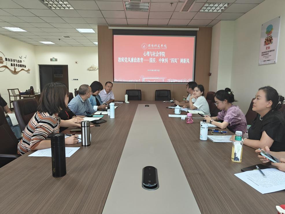 为深入贯彻落实全面从严治党要求,持续加固中央八项规定精神堤坝,在国庆、中秋双节来临之际,9月25日,心理与社会学院组织全体教师党员开展“国庆中秋纠四风树新风”专题党风廉政教育活动,旨在引导教师党员筑牢思想防线,严守纪律规矩,以优良党风带动教风学风,营造风清气正的节日氛围。