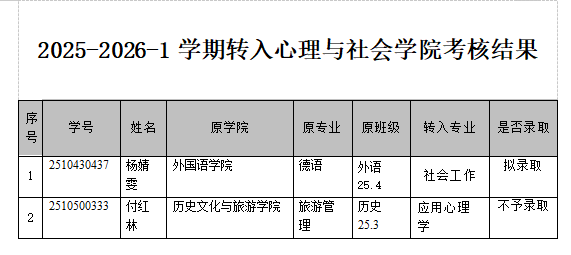 关于2025-2026-1学期第二轮学生申请转入心理与社会学院考核的通知