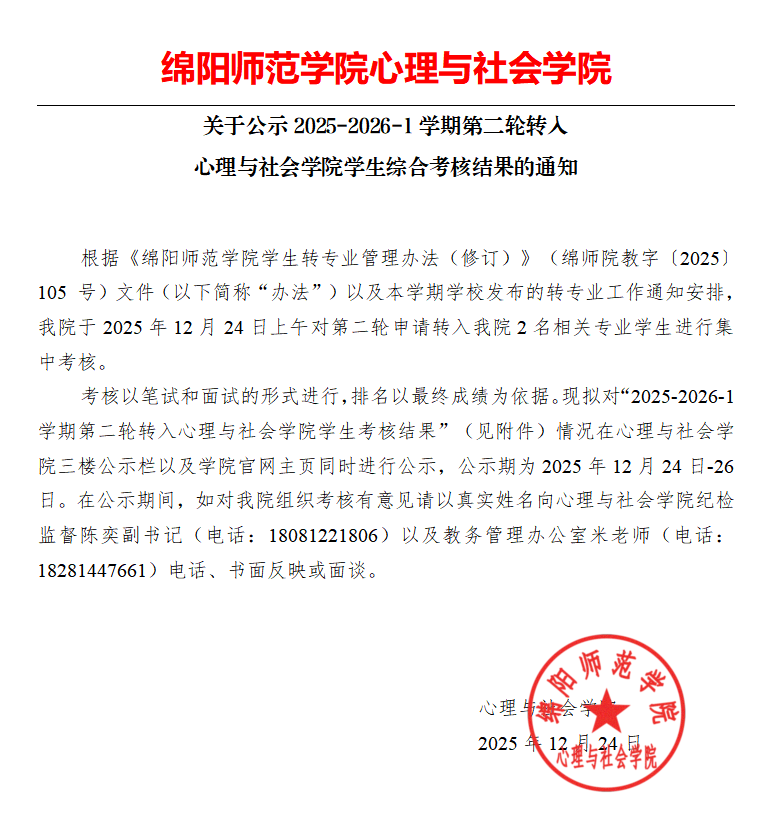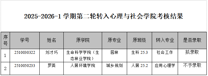 关于公示2025-2026-1学期第二轮转入心理与社会学院学生综合考核结果的通知
