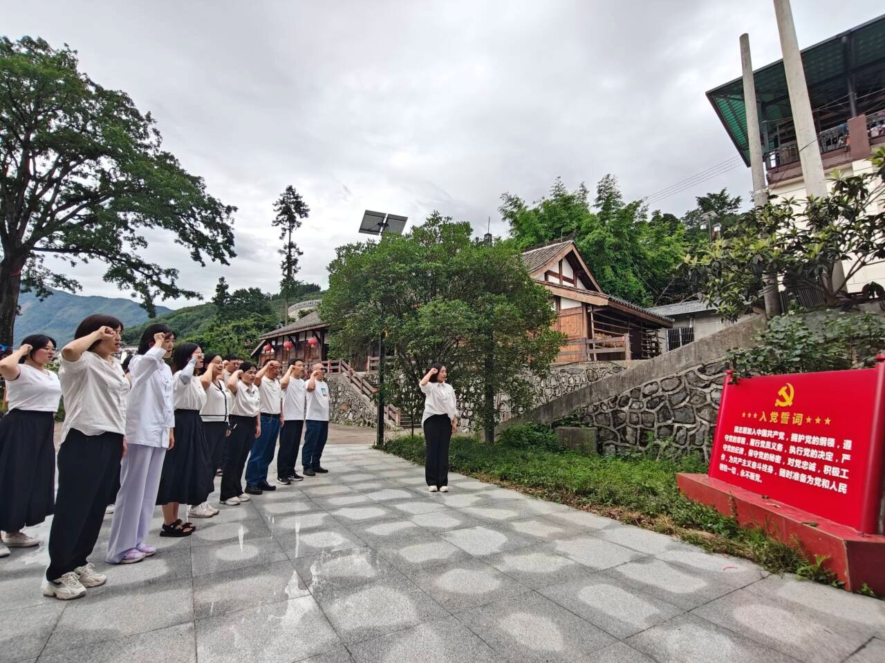 在村委会广场的党旗下,全体党员高举右拳,重温入党誓词。“为共产主义奋斗终身”的庄严承诺与山间清风交织,成为乡村振兴画卷中的动人注脚。青年党员教师木呷古布难掩激动:“站在这里宣誓,我更能体会到‘教育者’三个字的分量。未来要带着乡村调研的收获,把社会工作的专业课堂搬到田间地头。”活动中,支部还为党员发放了“作风建设承诺卡”,明确“每月参与1次社会服务”“每学期完成1项实践课题”等具体要求,推动誓言落地为行动。