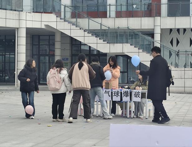 “压力气球‘爆破’大战”是现场人气环节。同学们在气球上写下压力源,将其绑在脚踝处踩爆,清脆的爆破声伴随压力消散,不少同学直呼“踩爆气球的瞬间,烦恼也消了许多”。