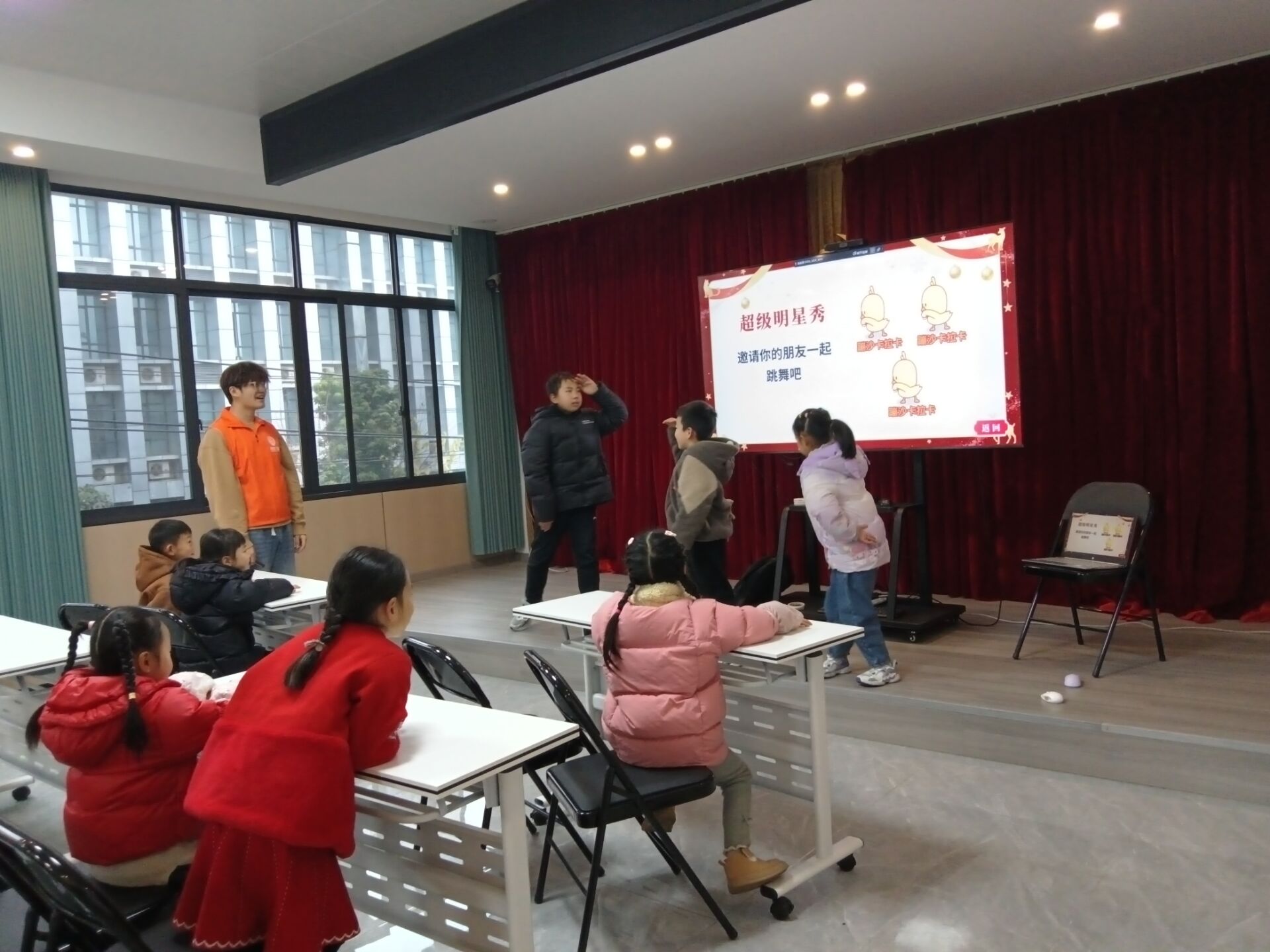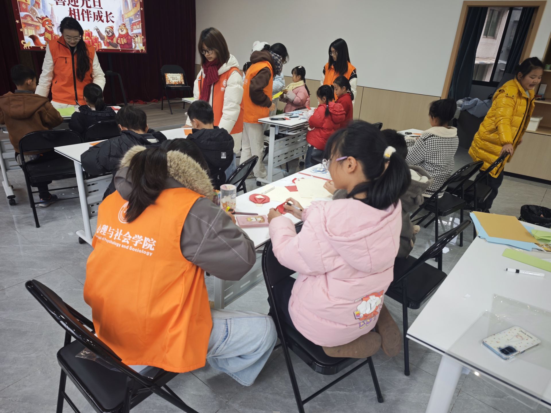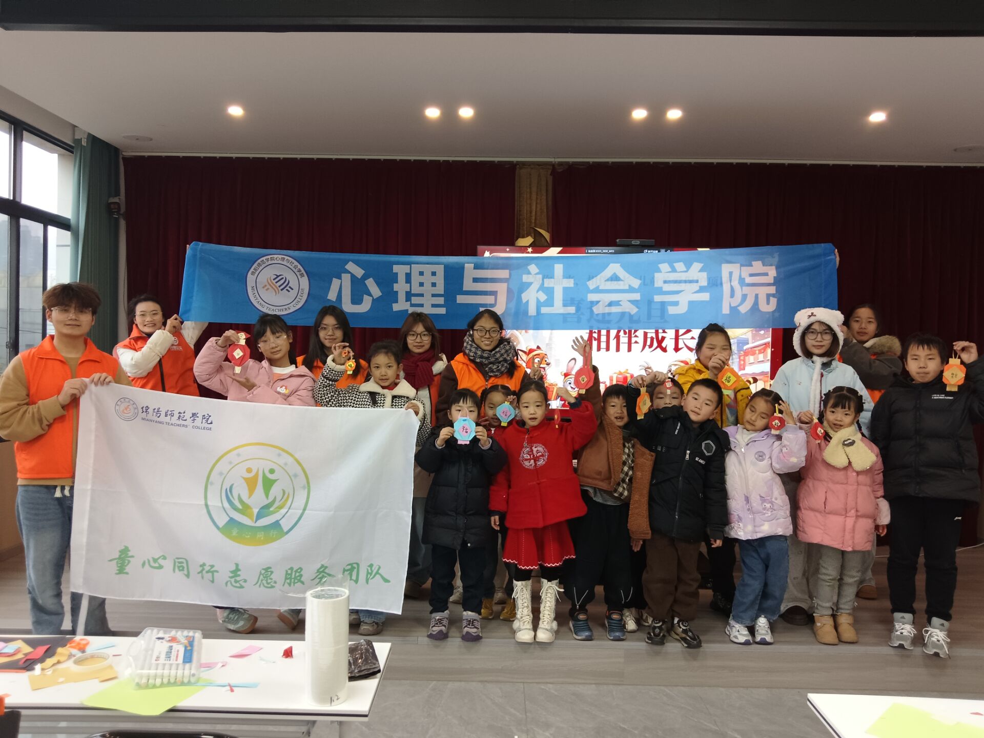 上午9时30分,活动以文化陪伴为主题。青马班学员们精心设计系列趣味环节,将理论所学转化为生动实践:“看字猜颜色”游戏迅速破冰,激发孩子们参与热情;“找不同”游戏锻炼观察与专注力;“明星模仿秀”将气氛推向高潮,学员们鼓励孩子们勇敢展示自我;在“巧手工坊”中,学员们耐心指导孩子们制作象征吉祥的小灯笼和“福”字。通过互动引导,学员们不仅丰富了社区儿童的课余生活,更在一线服务中提升了组织协调能力。