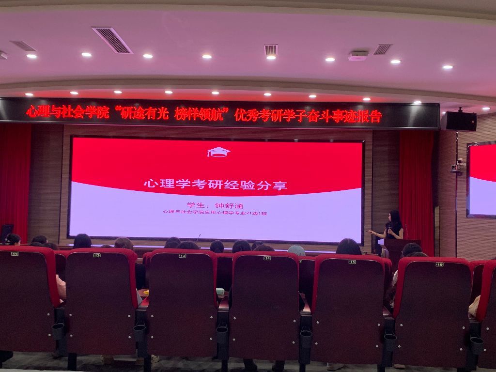 为充分发挥优秀毕业生的朋辈示范作用,进一步浓厚学院考研氛围,心理与社会学院分别于5月29日和6月5日在游仙校区和高新校区举办 “研途有光 榜样领航”考研学子优秀事迹报告会。来自应用心理学专业的钟舒涵和社会工作专业的李思瑶两位优秀考研学子倾囊相授,从备考策略到大学规划,为怀揣考研梦想的学弟学妹们带来一场干货满满的经验分享盛宴。