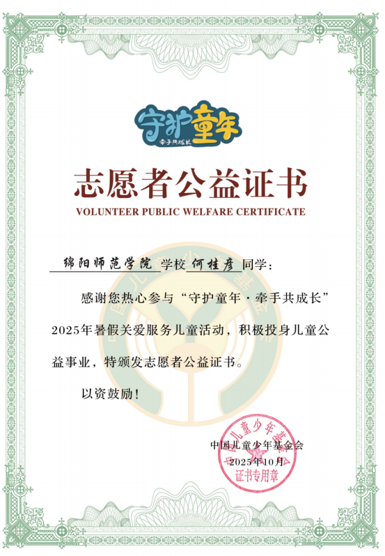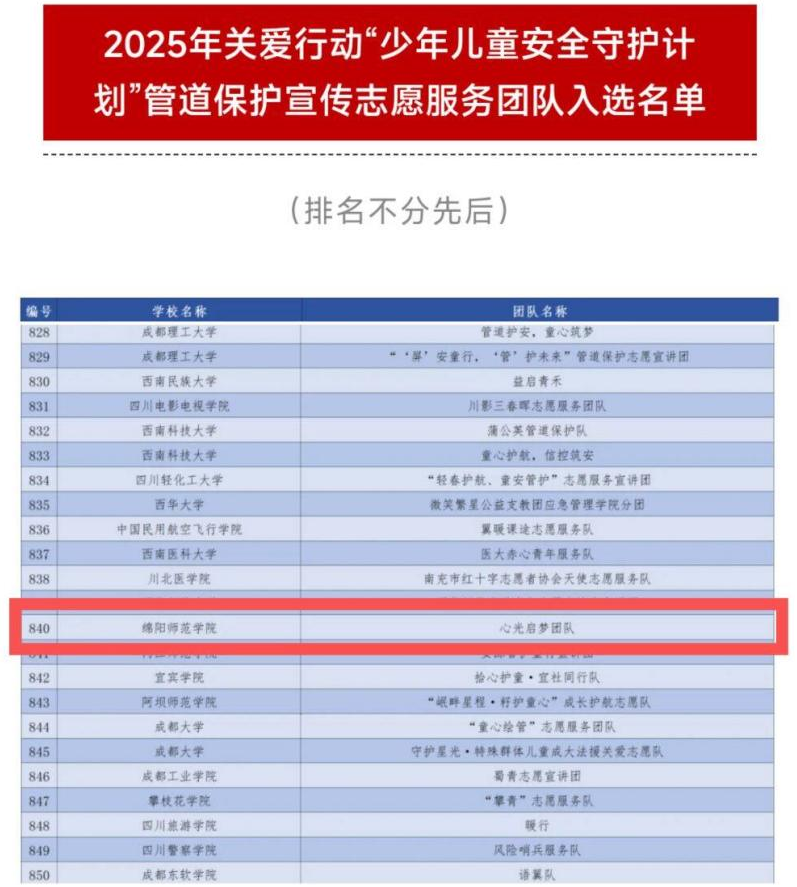 近日,绵阳师范学院心理与社会学院心光启梦团队接连传来喜讯,该团队在众多高校团队中脱颖而出,成为学校唯一入选并获得两项国家级志愿服务荣誉的团队,分别在“守护童年·牵手共成长”2025年暑假关爱服务儿童活动以及“2025年关爱行动‘少年儿童安全守护计划’管道保护宣传志愿服务”中大放异彩,充分展现了学院在志愿服务与人才培养方面的卓越成效。
