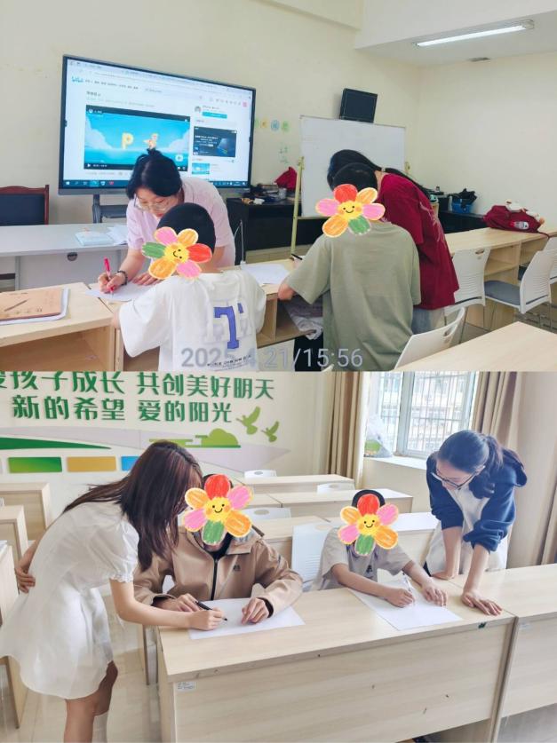 在前期准备阶段,分团委联合专业教师对志愿者进行培训,内容涵盖儿童心理特点、沟通技巧、安全防护等,为帮扶工作的专业性与安全性提供保障。过程中,志愿者们严格遵守帮扶计划,坚持“不缺位、不越位”,尊重孩子的成长节奏。面对弟弟书写不规范的问题,志愿者们手把手指导,强调书写姿势和笔画顺序;哥哥学习状态不佳、喜欢说小话时,志愿者们巧妙运用鼓励和提醒的方式,引导其专注学习。他们用真诚与耐心赢得了孩子的信任和保护中心的认可。