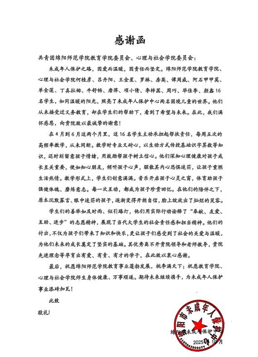 近日,绵阳师范学院心理与社会学院分团委联合教育学院收到绵阳市未成年人保护中心发来的感谢信。信中对两院16名学生志愿者(其中何桂彦、王金星、罗淋、房英、谭周威、阿石甲甲莫、牛舒畅、唐萍等12名主力志愿者均来自心理与社会学院)开展的困境儿童帮扶工作给予高度评价,称赞他们“如同温暖的阳光,照亮了两名困境儿童的世界”。此次获赠感谢信,是对志愿者们专业服务与奉献精神的肯定,也是心理与社会学院分团委坚持“专业赋能实践、服务育人为本”理念的生动体现。